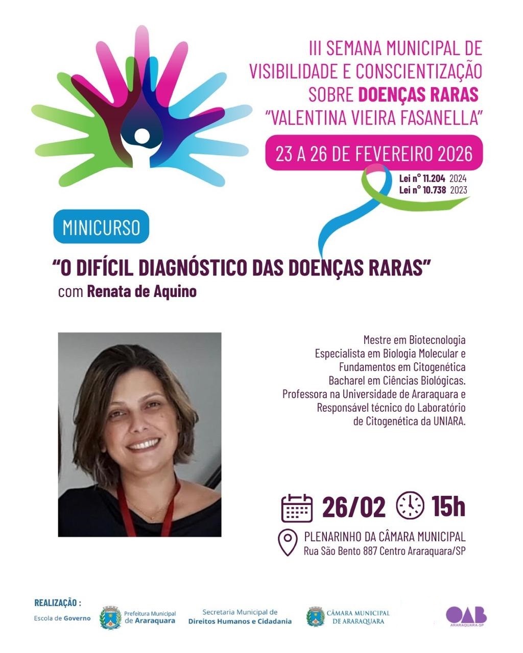 - 26/02 às 15h (quinta-feira)| Minicurso "O Difícil Diagnóstico das Doenças Raras" com a Profª Renata de Aquino. No Plenarinho da Câmara Municipal de Araraquara, na Rua São Bento, 887 - Centro.