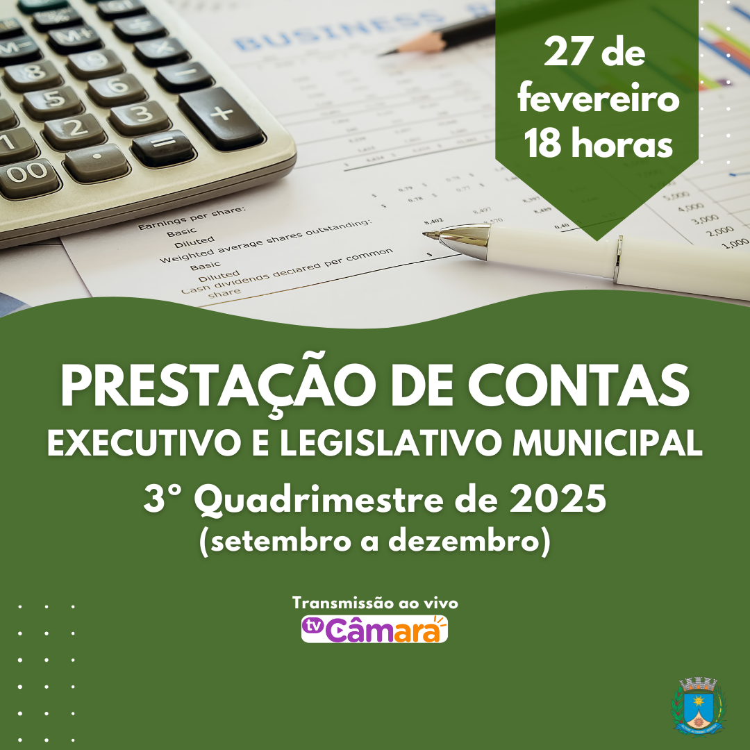 A Câmara Municipal de Araraquara convida para participar da audiência pública de Prestação de Contas dos Poderes Executivo e Legislativo de Araraquara/SP, referente ao 3º Quadrimestre de 2025, em cumprimento ao disposto na Lei de Responsabilidade Fiscal (LRF) - oficialmente Lei Complementar nº 101. A audiência ocorrerá no Plenário da Câmara Municipal, com transmissão ao vivo da TV Câmara.