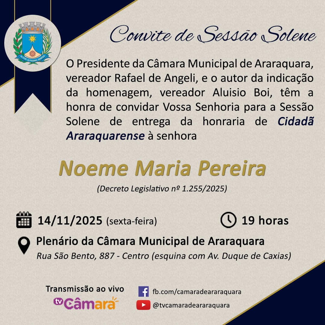 O presidente da Câmara Municipal de Araraquara, vereador Rafael de Angeli, e o autor da indicação da homenagem, vereador Aluisio Boi, têm a honra de convidar para a Sessão Solene de entrega da honraria de Cidadã Araraquarense à senhora Noeme Maria Pereira - conforme Decreto Legislativo nº 1.255/2025.