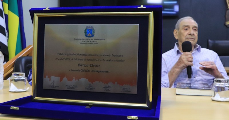 Sérgio Clérice relembrou o vínculo com a cidade, onde costumava passar as férias e conheceu a esposa. Ele agradeceu e disse estar alegre com a oportunidade de receber o Título de Cidadão Araraquarense. “É uma coisa que entrou aqui e vai ficar aqui”, declarou, apontando para o coração.
